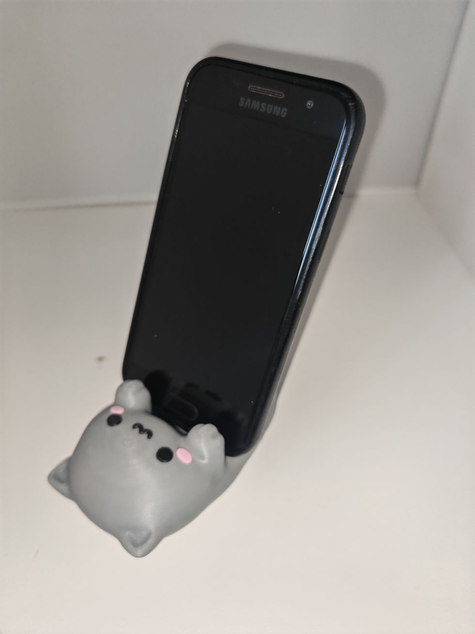 Kawaii Cat Phone Stand - Adorable Chibi Kitten Lying on her back holding phone.
